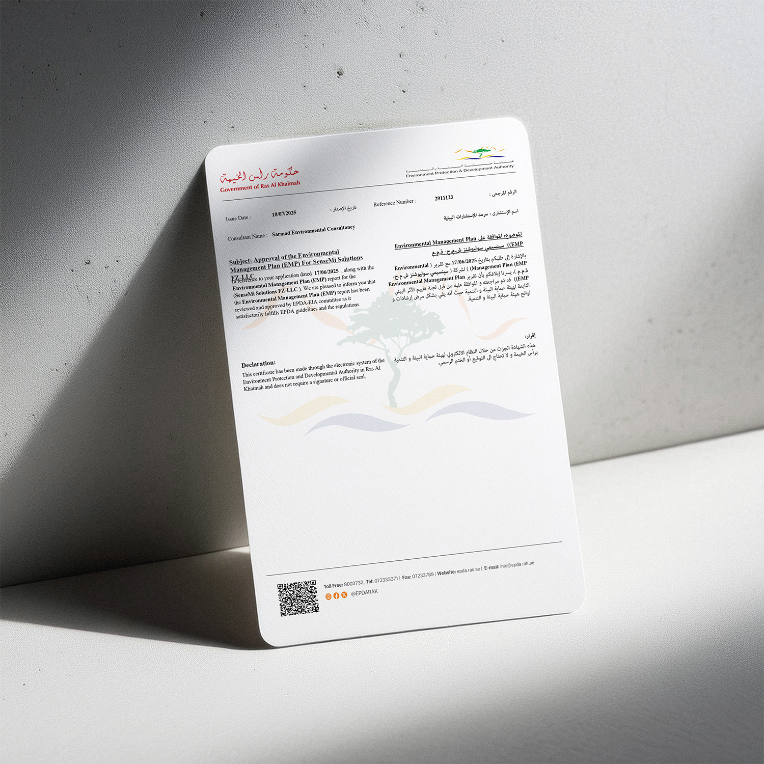Official approval certificate issued by the Environment Protection & Development Authority (EPDA), Ras Al Khaimah, for the Environmental Management Plan (EMP) of SenseMi Solutions FZ-LLC. This document confirms compliance with environmental regulations and successful review by the EPDA-EIA committee. Issued electronically, validating adherence to sustainability and environmental standards.